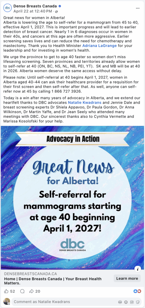 If you haven’t already heard the news that validates what I, and many others, have been advocating for: On April 22, 2026, the Government of Alberta announced it is lowering the breast cancer screening age to 40, effective April 1, 2027.